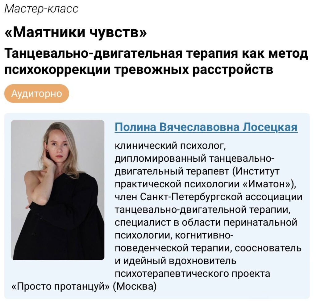 Мастер-классы саммита от действующих танцевально-двигательных терапевтов Санкт-Петербургской Ассоциации танцевально-двигательной терапии. Подробная информация по ССЫЛКЕ (кликабельно).