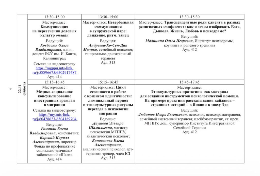 В рамках программы конференции состоится танцевально-двигательный мастер-класс семейного психолога и танцевально-двигательного терапевта Малики Андреевой-Ко-Сен-Дин (Санкт-Петербург, Россия). Занятие пройдёт 22 ноября с 13:30 до 15:00 в аудитории 313.